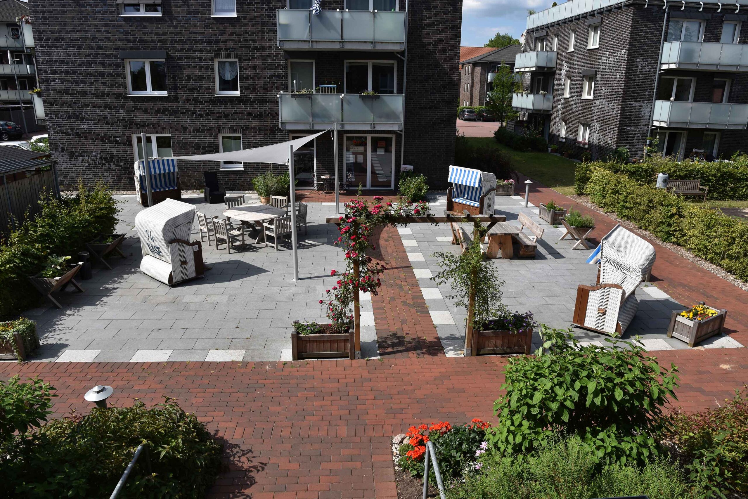 Gartenmöbel und Strandkörbe wurden aufgestellt, ein Sonnensegel wurde installiert und am Eingangsbereich des Platzes wurde ein Blumenbogen aufgebaut. Rund um den Platz stehen Blumenkübel, die durch Paten bepflanzt und betreut werden.